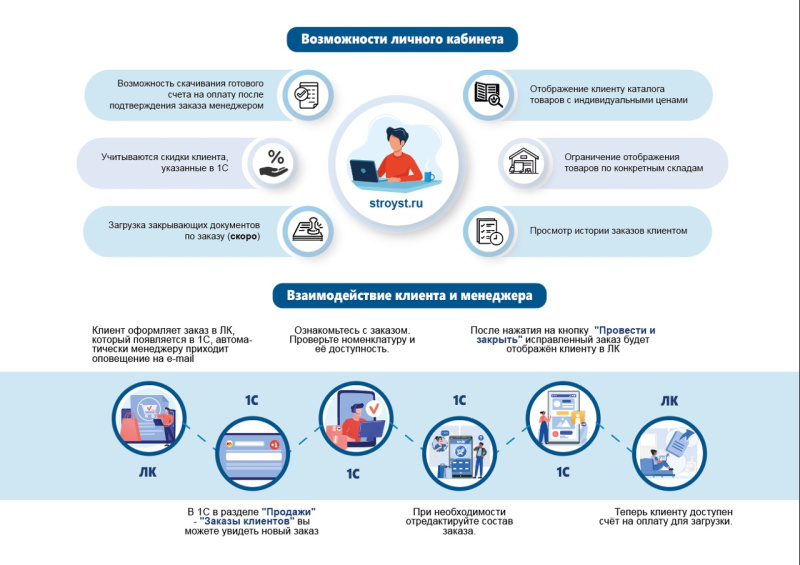 Механизм взаимодействия построен по чёткой схеме:- Оформление заказа клиентом. Клиент заходит в личный кабинет и оформляет заказ — все данные автоматически передаются в систему 1С. Менеджер сразу получает оповещение на электронную почту.