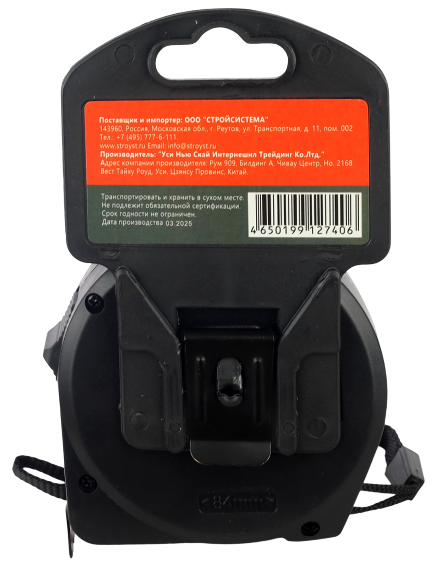 Корпус рулетки изготовлен из прочного ABS - пластика. Для удобства произведения замеров в углах и труднодоступных местах, на корпусе рулетки указаны ее размеры. Качественное износостойкое полотно обеспечивает повышенную длину вылета ленты без излома.
