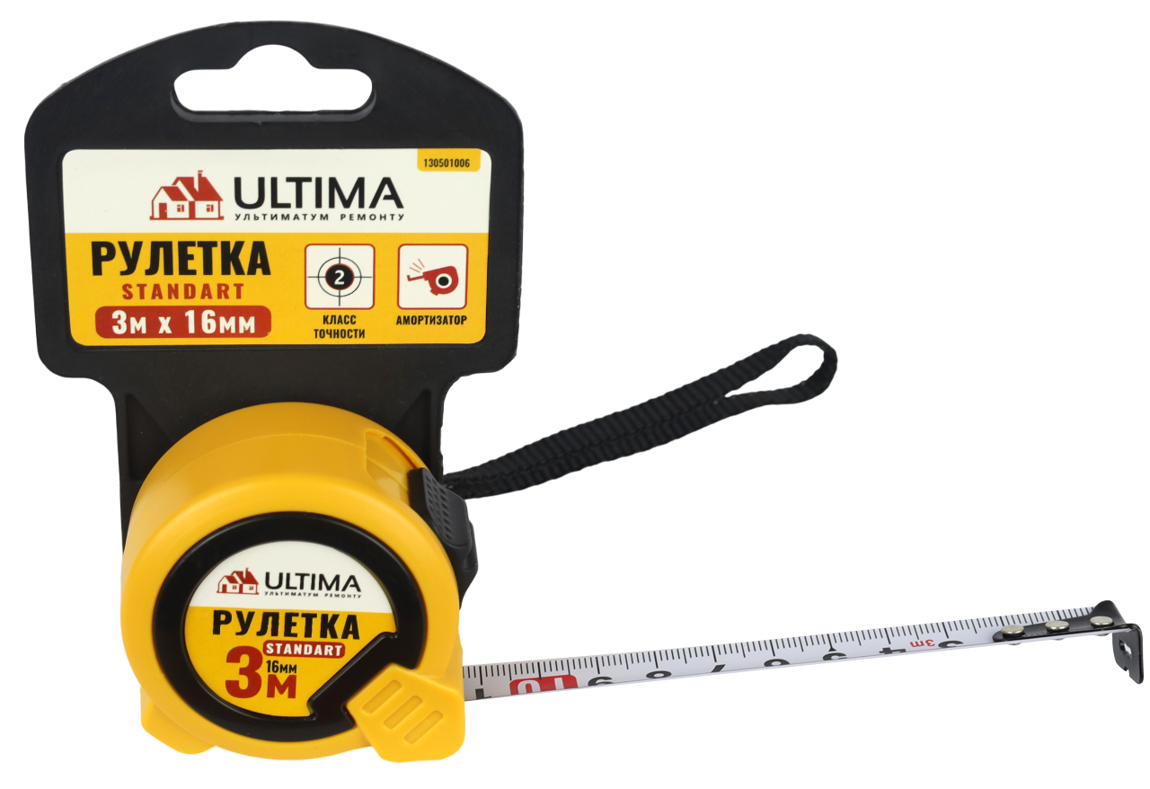Эргономичный двухкомпонентный корпус рулетки Ultima Standart сделан из ударопрочного пластика и удобно лежит в руке. Качественное износостойкое полотно обеспечивает повышенную длину вылета ленты без излома.