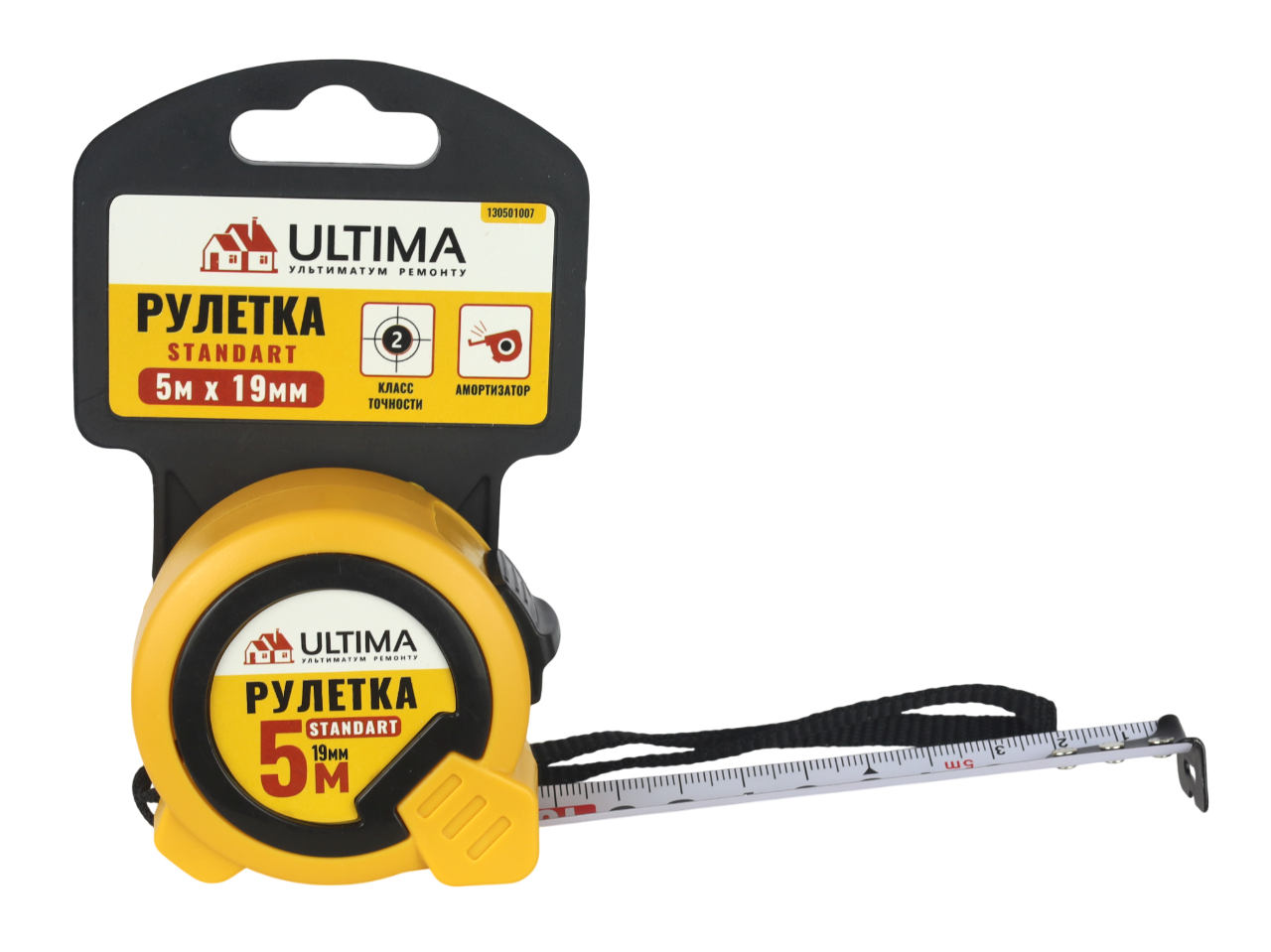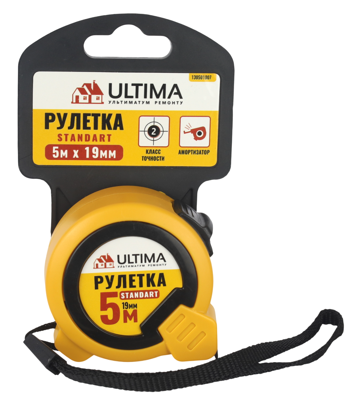 Эргономичный двухкомпонентный корпус рулетки Ultima Standart сделан из ударопрочного пластика и удобно лежит в руке. Качественное износостойкое полотно обеспечивает повышенную длину вылета ленты без излома.