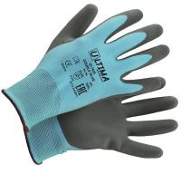 Конструкция: Основа полиэстер с двойным латексным покрытием. Внутреннее покрытие: полностью облиты латексом голубого цвета. Внешнее покрытие: покрытие ладони и кончиков пальцев темно-синим латексом с песчаной поверхностью.